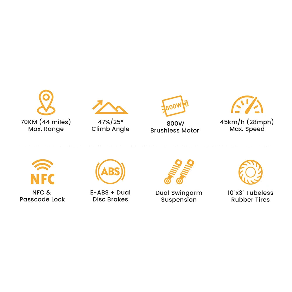 Dual swingarm suspension, combined with front shocks, works with 10-inch tubeless tyres for stability and grip across mixed terrain. The puncture-resistant design absorbs uneven ground, keeping rides smooth and controlled.